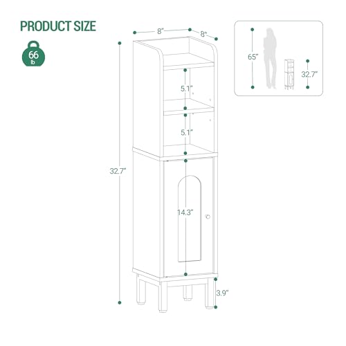 【Fit for Narrow Space】Please Note the Size. This space-saving bathroom cabinet measures 8″ D x 8″ W x 32.7″ H, ideal for narrow space, arched door design and metal base not only add beauty to your bathroom but also easy to clean, no fear of soaking, no need to worry about cracked wood panel
