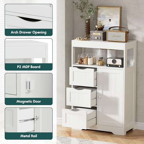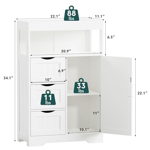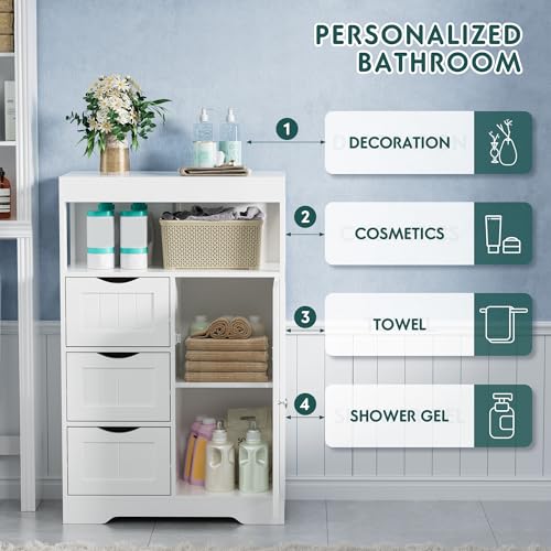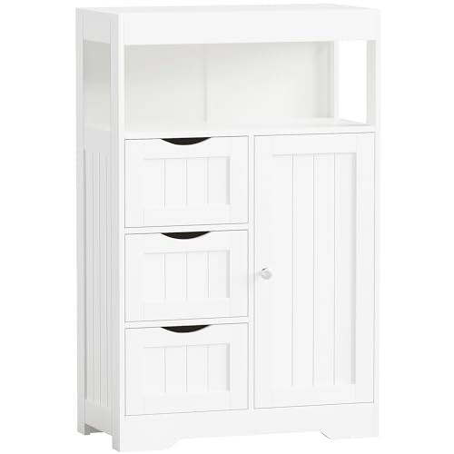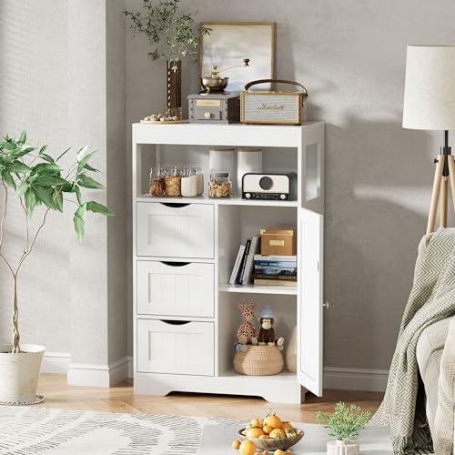 JUMMICO Bathroom Floor Cabinet, Wooden Free-Standing Storage Organizer with 1 Door and 3 Drawers, Bathroom Storage Cabinet for Living Room/Kitchen/Hallway/Home Office (Light White, 3 Drawers)