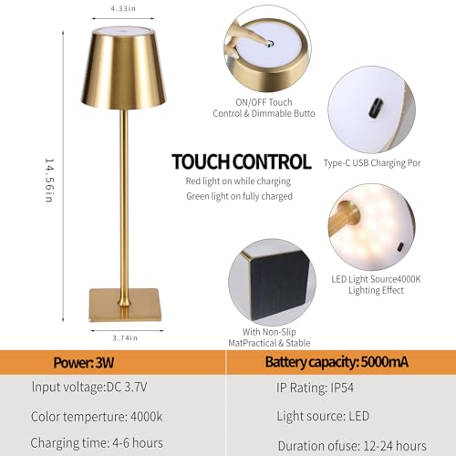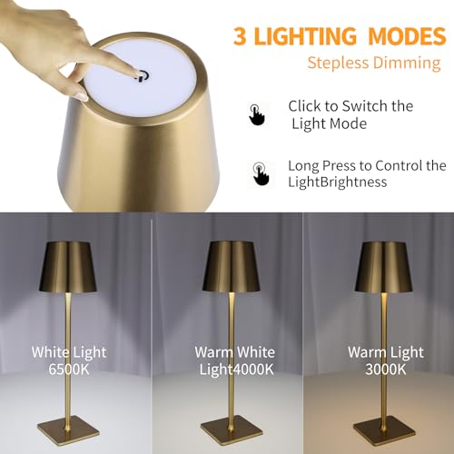 【3 lighting modes and stepless dimming】 Our small gold touch lamp cordless is available in 3 color temperature options: Warm light, warm white light and White light. Touch control: Click on/off and toggle the light mode. Long press to control light brightness (10%-100%). When you turn on the nightstand light again, it records the brightness of the last adjustment.