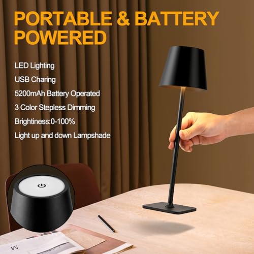 Cordless Table Lamps Rechargeable, Adjustable Height, 5200mAh Battery Operated Lamp, 3 Color Stepless Dimming Up, Outdoor Table Lamps for Dining, Bedroom, Outdoor (2 Pack)