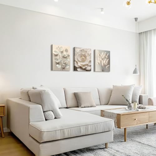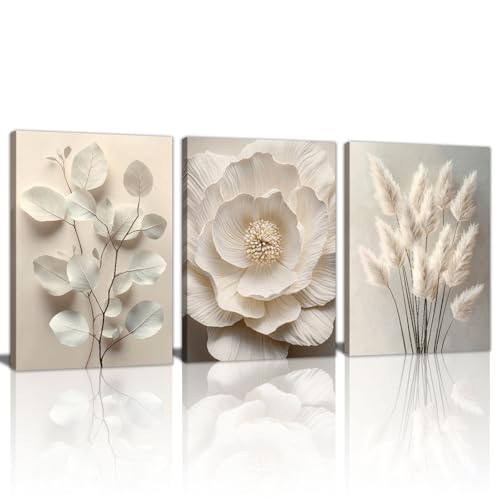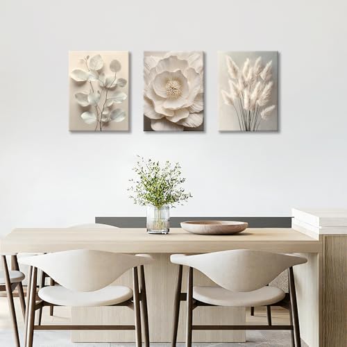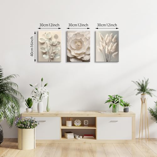 3Pcs Beige Floral Botanical Frame Canvas Wall Art, Neutral Textured Flower Plant Wall Painting Picture Wall Decor Vintage Blossom Posters Prints for Bedroom Living Room Reay to Hang 12″x16″x3Pcs