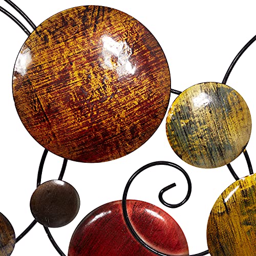 MULTI COLORED AND RED WALL ART FOR LIVING ROOM: This abstract metal wall decor has a patina finish with colors of red, bronze, black, and yellow that brings charm to your space