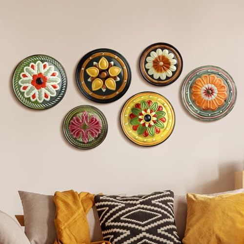 Tandefio 6 Pcs Metal Wall Decor Metal Flowers over Round Base Colorful Hanging Artwork Art Decorations 3D Plate Home Wall Decor for Bedroom Living Room Office